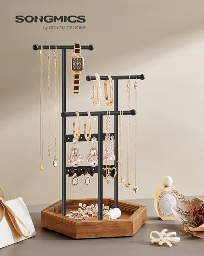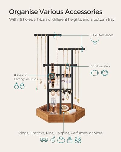 - [Versatile Jewelry Storage] This jewelry organizer has 16 openings for stud earrings, 3 T-shaped bars of different heights and a jewelry tray to neatly store earrings, rings, bracelets, necklaces and even long chains