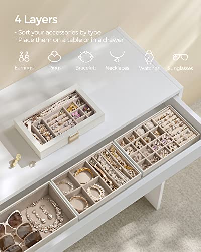- [Versatile] This drawer jewellery organiser with 4 removable trays that can be placed on the dressing table, in the drawers or walk-in closet, making it more convenient to match earrings, necklaces, rings, bracelets, brooches and other accessories