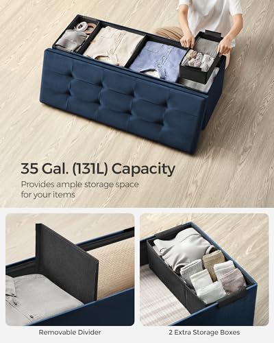 - 【AMPLE STORAGE】This 38 x 110 x 38 cm storage bench offers a 131 L capacity, perfect for books, blankets, and more. It also comes with 2 extra storage boxes for small items and a removable divider for categorised storage