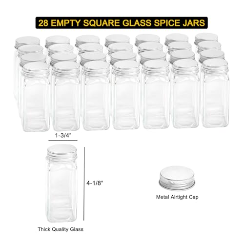 - 28 Glass Spice Jars – Made of lead-free durable glass; Feature sift and pour lids allow you either shaking or measuring with spoons, metal airtight caps keep your spices stay fresher longer; The funnel makes adding spices mess-free