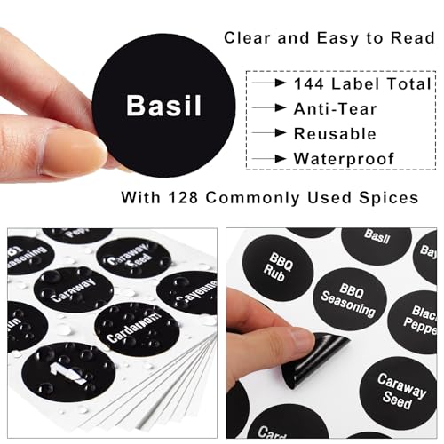 - Spices Organizers: Spice labels are 144pcs spice labels stickers in total, preprinted 128pcs pre-printed commonly used spices, 8pcs numbers(1-8), 8pcs blank label so you can wirted your own mixes spice name. (Note: Labels only, jars are not included.)