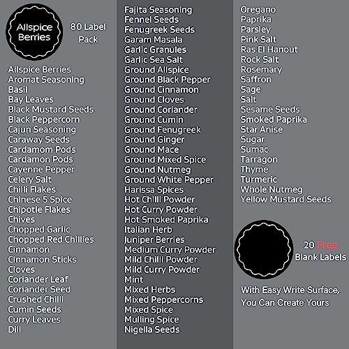 - Versatile and Practical: With 80 pre-printed labels and 20 blank labels included, this set offers you a wide range of options to organize various spices and seasonings in your kitchen. The black color design adds a sleek and modern touch to your pantry storage.