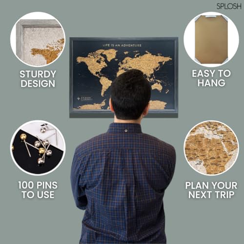- Detailed: Splosh Travel Map of the World is complete with sharp borders, framed on a cork board by a wooden frame so all countries are clear and visible. Our pinboard is light and easy to handle!