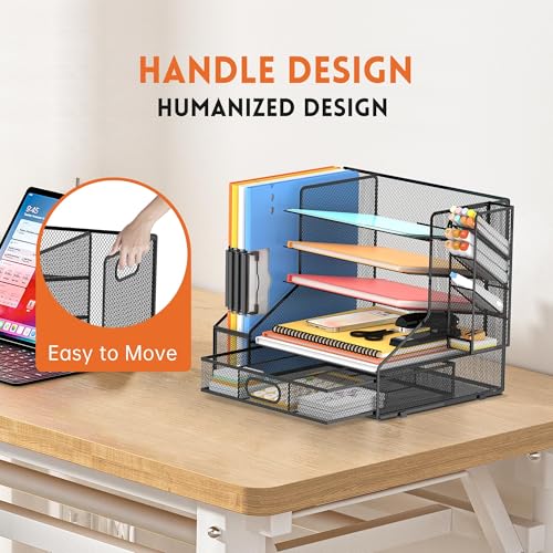 - HANDLE DESIGN – The handle design of this 5-tier desk file organizer is very user-friendly. With two portable handles of this paper organizer storage, you can move the desk organizer with file holder to any place you want. It's very convenient.