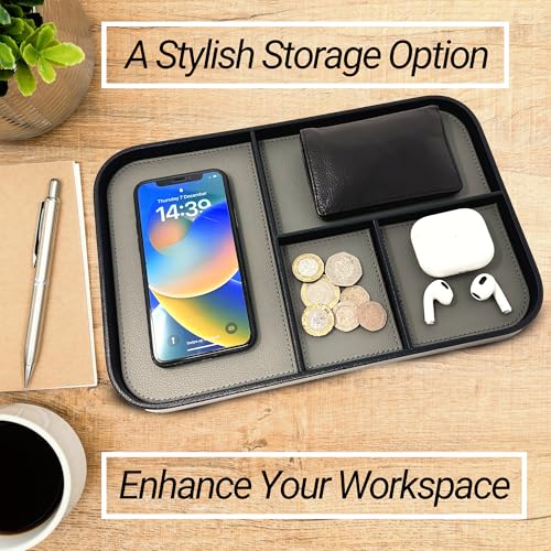 - 📦 VERSATILE STORAGE FOR EVERY NEED – From keys to jewellery, phones, or daily essentials, our valet tray adapts seamlessly to organize any space, making it a functional and stylish solution for every room including bedrooms, hallways, study room / office, bathrooms and the kitchen. Use as charging tray for your mobile phone or wireless headphones.