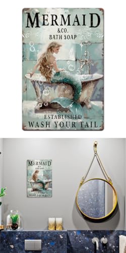 - Vintage Bthroom Tin Sign: 1 pcs of iron-made metal tin sign art poster decorated with mermaid on the bathtub, with the text "wash your tail" for bathroom wall decorations. The funny room decor vintage metal tin sign will add personality and style to your room area.