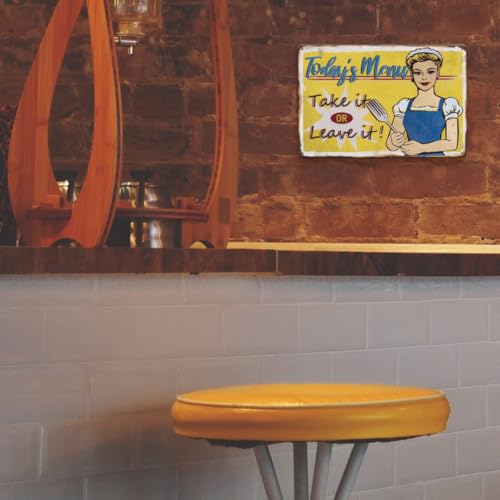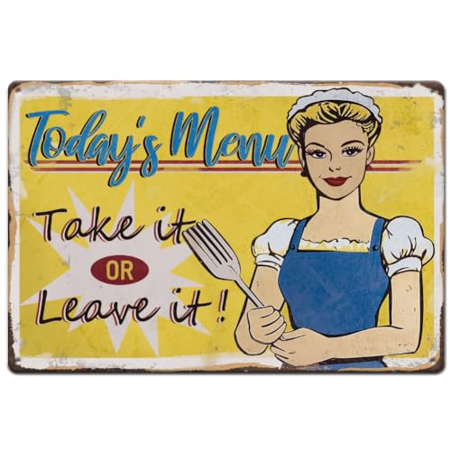 - Funny Kitchen Vintage Tin Sign: 1 pcs of iron-made funny tin sign designed in dinner themes, a female cook with lettering "today's menu take it or leave it", for your kitchen.