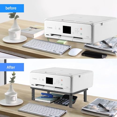 - STURDY MATERIAL: Large 370 x 235mm durable metal shelf fit most flat screen display, laptop and printer, maximum support weight up to 20kg. Anti-skid rubber pads prevent slipping or damage to your work surface. Sleek modern black design complements any desk while adding extra space underneath the stand for storage.