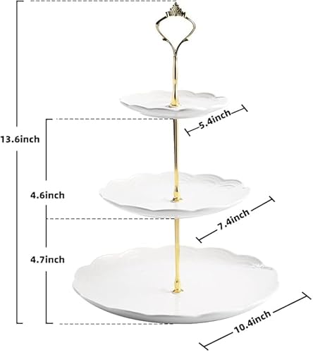 - Just the Right Size: Overall height- 13.6 inch/ 34.5cm. Diameters: Bottom tier: 10.4 in / 26.4cm,Middle tier: 7.4 in / 18.8cm, Top tier: 5.4in / 13.7cm. Space between tiers: 4.6in and 4.7in.