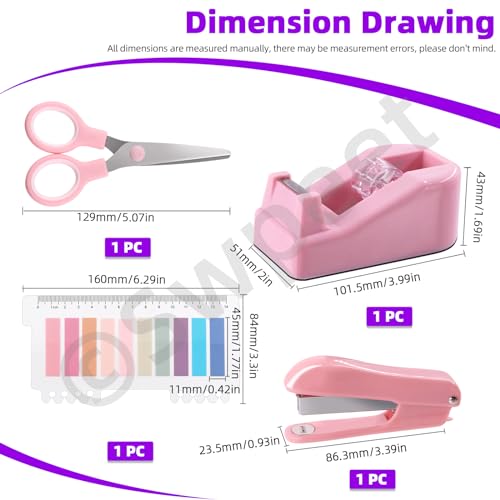 - 💥【What You Get】—— In this kit, you will receive a pink office supplies kit which comes with 1pc stapler, 1pc tape dispenser, 1pc staple remover, 1pc 10 colors tabs with ruler, 1pc Scissors, 1 box staples, 1pc clear tape, 1pc sticky note and 1 box accessories( including push pins, big clips, small clips and paper clips), in total of 9pcs. Such a complete pink desk accessories combination is enough to meet your school and office using needs.
