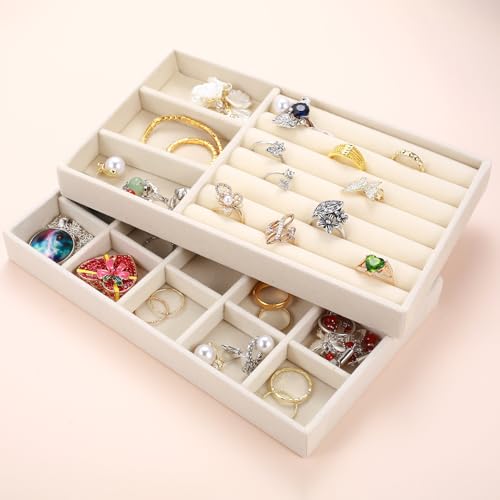 - Premium Materials: Made of soft flocking and sturdy MDF, the jewelry organisers feel delicate to the touch while ensuring durability. The stackable trays fit seamlessly into drawers, dressers or shelves
