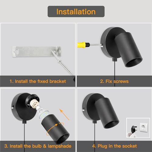 - Easy to Install: Supplied with installation kit and user manual. Plug in wall lights for bedroom can be mounted on the wall as a wall light, remove the lampshade and install the GU10 light source, simply plug in the power plug and and switch on.