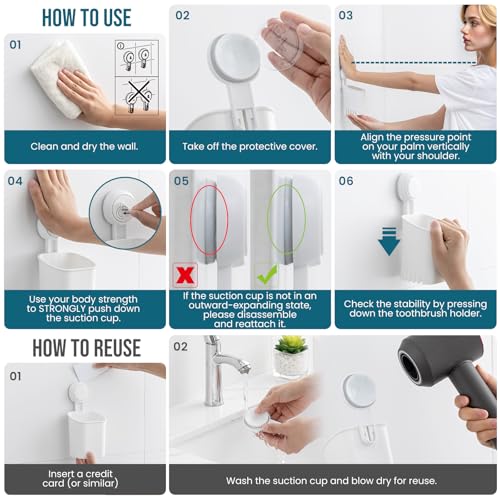 - Hassle-free Installation: Simply press down the suction pad to squeeze the air out, the toothbrush holder will stick to the wall firmly. You can finish the installation in 1 second. No screws, no nails, no glue, no tools. Can be re-positioned many times and removed without leaving residues. (Please clean the wall and keep it dry and attention to avoid the ceramic tile crack to make sure vacuum suction)