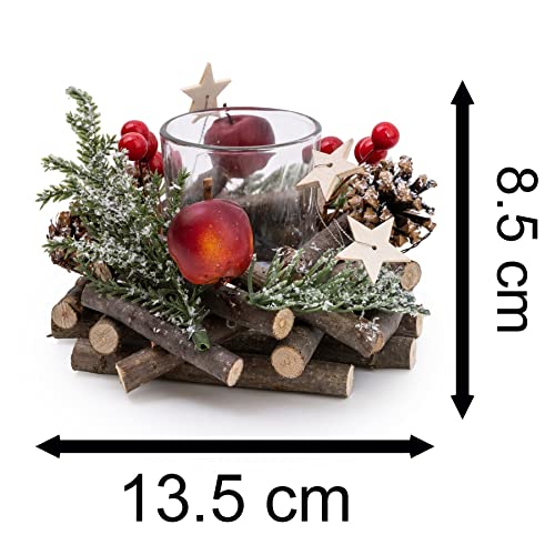 - CHRISTMAS TEALIGHT HOLDER | Our traditional Christmas tealight holder is perfect for adding a touch of festive charm to your holiday decor. Featuring a selection of natural pine cones, delicate Christmas stars, and juicy red apples interspersed with artificial red berries. Light up the evening with the warm glow of a flickering tealight and relax in the cosy atmosphere of the festive season. Ideal for adding a touch of rustic charm to any room.