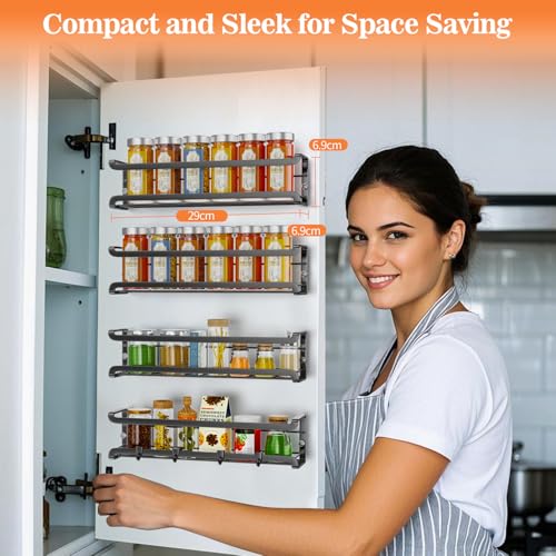 - 4 Pack Spice Holder: Our 4 single-tier spice racks designed for maximum flexibility. Spice Organizer Size 6.9x29x6.9 cm, this measurement ensures a snug fit for your spice jars, reducing rattling when opening cabinet or pantry doors.