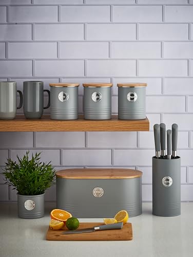 - BREAD BIN | Living grey bread bin is perfect for organising fresh baked goods on the countertop. The subtle pastel grey is perfectly complemented with the silver 'bread' badge which adds a touch of elegance to the accessory. The sustainably sourced bamboo lid can double as a cutting or preparing board.