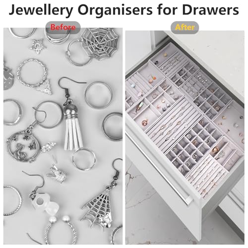 - 【Quality Material】Jewellery organiser trays are made of soft velvet flocking fabric material, which is soft, sturdy, comfortable, non-slip, wear-resistant, delicate and elegant; the flexible compartment of the tray can be adjusted to accommodate various sizes of jewelry, and the jewelry organizer tray can be used to keep your items in pristine condition.