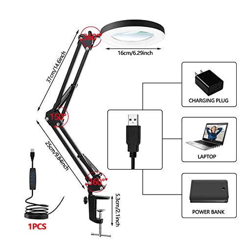 - 【2 in 1 Magnifier Lamp】This magnifier desk lamp has a metal clamp and a 5V/2A adapter, it provides maximum efficiency of illumination brightness. So you can fix it anywhere without other tools.