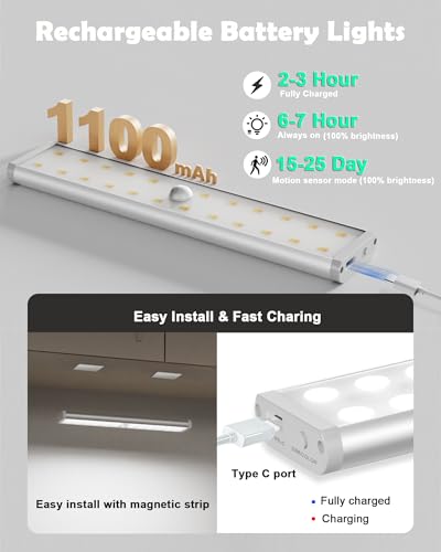 - 【 Sensitivity & USB C Charging】By enhancing PIR technology, we have boosted the wireless sensor sensitivity and brightness of the under cabinet lights by 30%. It offers 2 sensing modes – night sensing and day sensing, and utilizes a more widely compatible Type-C interface to charge the built-in 1100mAh Li-ion battery, taking about 2 hours for a full charge. In "Motion Sensor" mode, the lights can power under cabinet lighting for 30 to 50 days (when LED lights are activated 3-5 times per day)