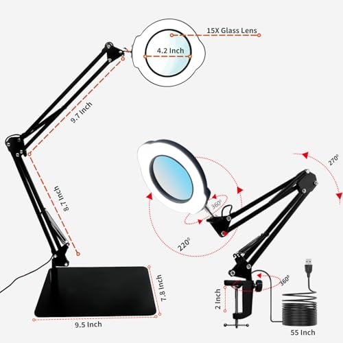 - 15X Magnifying Glass Lamp with Clamp and Base: This lighted magnifying glass adopts 4.2'' Real Glass Lens, made of premium optical glass, which provides clear, high definition, and wider view, especially suitable for those who undertake continuous close focus work or any vision problems. Say Farewell to eye strain or dizziness when concentrating on your DIY crafts, Reading, Sewing, Painting, Engraving, Drawing, Pottery, Cross Stitch, Jewelry, Crocheting, Miniature Painting, Repair, Woodworking, Manicure, Embroidery, Diamond Painting, Welding, Nail Art, Soldering, Puzzles or Other Close Work or other hobbies that require long-time use of your eyes