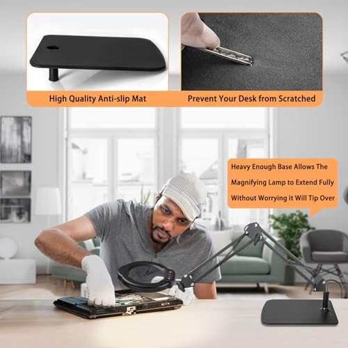 - Heavy-duty Metal Base & Desk Clamp: This magnifying desk lamp with light and stand is equipped with 9.5 x 7.8 inch super large metal base, which is heavy-duty, stable and movable, providing sturdy support for most of extended length or angle needs at work. Besides, a desk clamp is included, supporting a max. 2" surface thickness, making it possible to use this led lighted magnifier anywhere as your preference, such as desktop, table, workbench, shelves, lab, etc