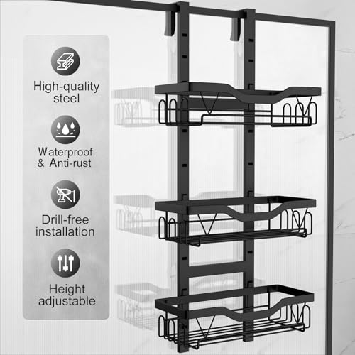 - 【STURDY HANGING DESIGN】Our hanging shower caddy is suitable for use on bathroom glass doors. To make the bathroom shelf more stable, we attached four suction cups to the back of the stand and fixed EVA foam strips to the hooks of the stand. This design prevents the shelf from scratching your glass door and protects your glass door, each shower caddy can hold up to 40 lbs, so you don't have to worry about it shaking or falling.