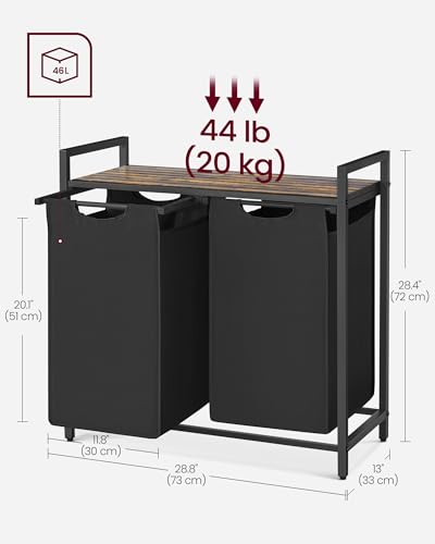 Vasagle BLH201B01V1 Dirty Laundry Basket, 2 Compartments, Bin, with 2 Removable Oxford Cloth Bags, Metal Frame, 2 x 46 Litres, 73 x 33 x 72 cm, Rustic Brown and Black