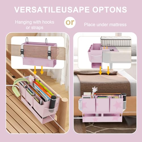 - 【Bed organiser with Power Strip Compartment】: This versatile hanging caddy offers 3 flexible setup options: Securely attach to bed frames using reinforced hooks, fasten with adjustable straps, or slide the rigid backing board under mattresses. The bottom is designed with power strip storage space, which can better accommodate the use of power strips and meet charging needs. Perfect for dorm rooms or hospital beds where outlets are scarce, it transforms any bedside into a charging station while storing phones or tablets.