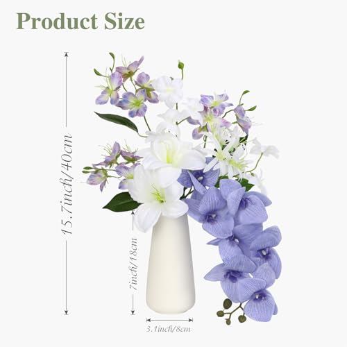 - 【Appropriate Size】Arificial Flowers in vase are 15.7 inches tall, and the vase is 7 inches tall and 3 inches in diameter. Artificial floral arrangement with vases is suitable for core table decoration.The vase matches the perfect size of the bouquet to provide comfortable home decor