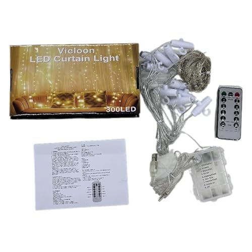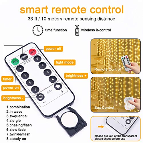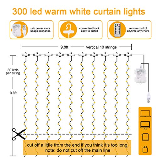 - 【High quality 300 LED Curtain Lights】 3Mx3M, this fairy string curtains lights made of copper wire, contain with 300 pcs super bright LEDs. It is completely sealed, very safe, soft and firm.