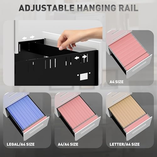 - Three drawers: Two small and one large – under desk drawers offers plenty of room for home office and work essentials. The detachable pencil tray makes it easy to take out stationery in one go. Adjustable hanging rail in large drawer for A4 sized files