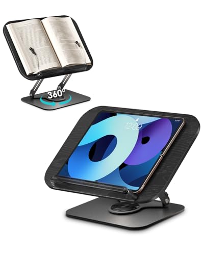 - 【Adjustable&Rotable】 The base of this cookbook stand offers a smooth 360° rotation, providing you with the convenience to adjust it to any desired angle for optimal book viewing. The board itself has a swing range of approximately 180 degrees. With a height adjustment range spanning from 1.5-13.4" / 3.8-34 cm, you have the flexibility to position your book at a height that suits your line of sight. This feature helps alleviate strain on the neck, shoulders, and lower back.