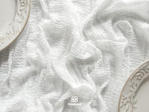 - 【Daily Care】To maintain the folds of the cheesecloth table runner, machine wash in a laundry bag with mild detergent or hand wash in cold water with mild detergent, do not dry clean or bleach, no ironing required to maintain the texture of the folds and dry naturally.