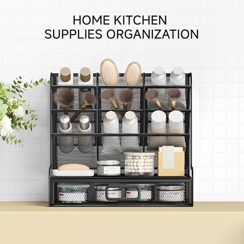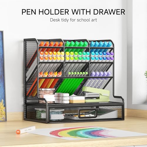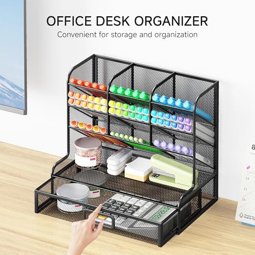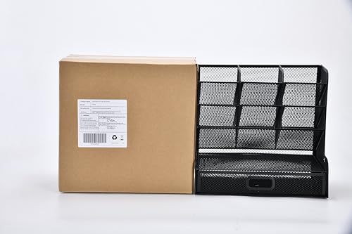 - Desk Organiser: This metal mesh desk tidy organiser has 9 compartments and a drawer, enough space to help sotorage some art or stationery supplies. Large capacity, multifunction help you arrange the desk gadgets and stationary clean and tidy