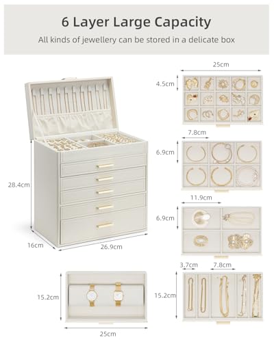- [6 Tier Drawers] VLANDO Large jewellery box with multiple layers with different compartments and layouts to keep all your jewellery. Enough to store all kind of jewellery accessories, such as earrings,rings,necklaces,bracelet,watch or sunglasses.the deep bottom drawer with a watch pillow that can store your watch better.