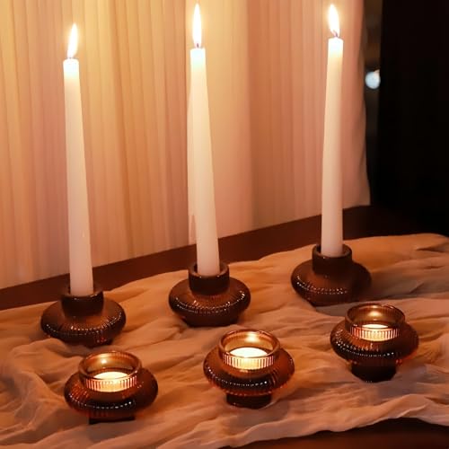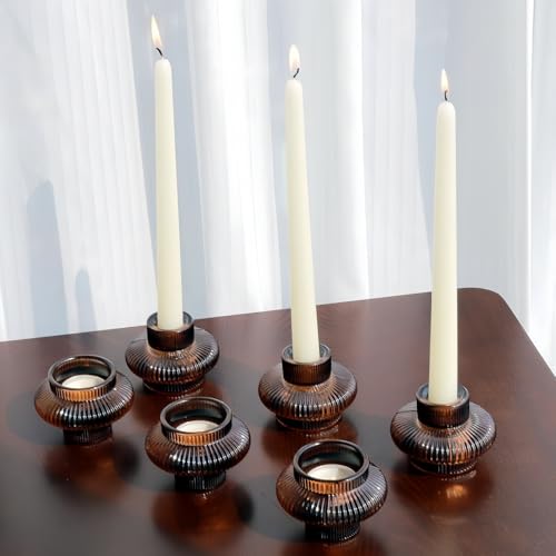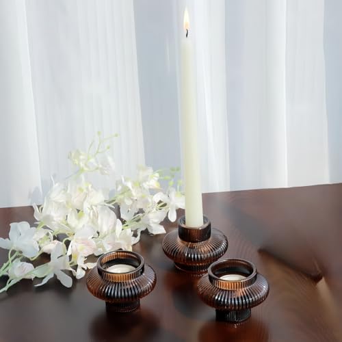- [Ribbed Taper Candle Holder]: Vohocandle brown candlestick holders selects high-quality clean glass, with enough (8 cmW x 6 cmH / 65g) to hold down candle sticks or table runners without being toppled over