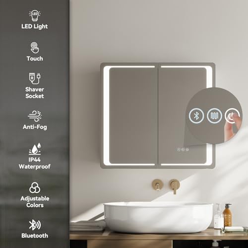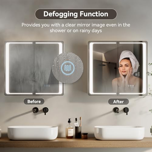 - 【Shaver Socket and Anti-fog Function】This bathroom mirror cabinet with shaver socket on the inside for charging electric shaver or toothbrush.The bathroom mirror is equipped with a demister pad that you can get a clear mirror even in the shower or wet weather.