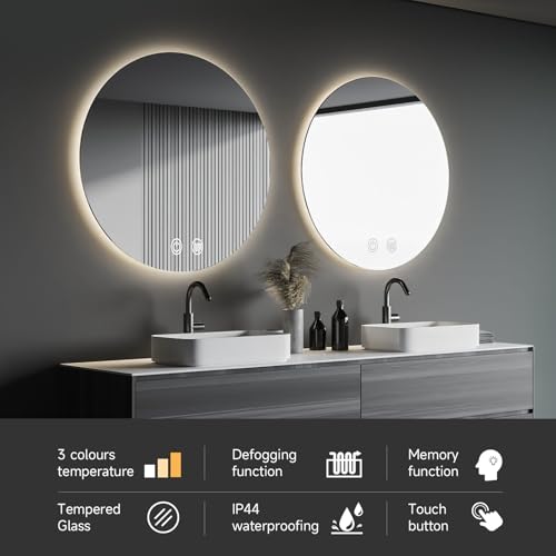 - 【3-Color Smart Light】This round bathroom mirror features 3 colour dimmable lights, you can touch the button to switch between warm white, natural light and cool white.You can choice your favourite color temperature in daily lives.