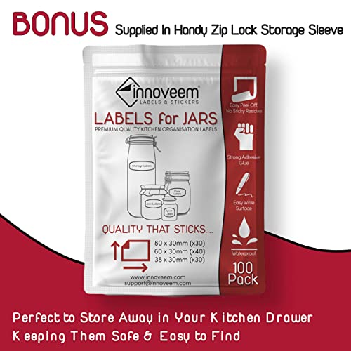 - Practical – 3 different sized labels to label and organise your pantry. Ideal for Storage Jars, Food Jars, Jam Jars, Spice Jars, Freezer Labels and much much more. 30 labels 80 x 30mm, 40 labels 60 x 30mm & 30 labels 38 x 30mm.