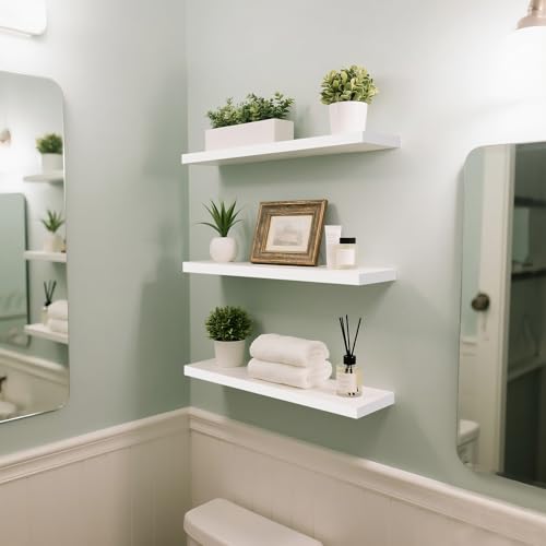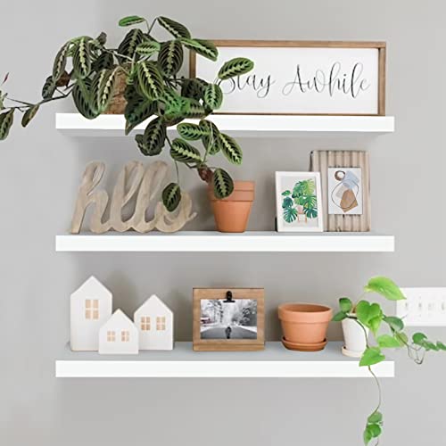 - 【FREE UP SPACE】 These white floating shelves can maximize use wall space while taking up zero square feet.The shelf reduces clutter and highlights décor in compact spaces and provides unique shelving solutions to any style home decor.The wall shelves measures 43x13x1.5cm(17×5.1×0.6in ).There are three pieces same size shelves in the package.