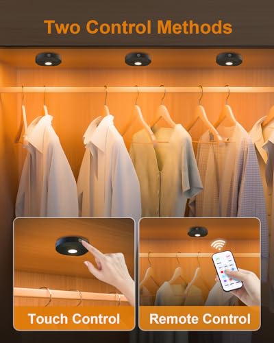 - [Two Control Modes & Timer Function]-The puck lights offer two control options: touch control and remote control. A short tap lets you turn the lights on/off or switch between colors, while a long press adjusts the brightness. The remote also features a timer, allowing you to set the rechargeable under cupboard kitchen lights to automatically turn off after 15, 30, or 60 minutes. These wardrobe lights are an excellent choice for cabinet, countertop, closet, or shelf lighting.