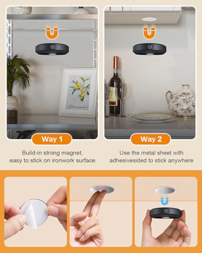 - [Wireless Portable & Easy Install]-Method 1: Each under counter lights features built-in strong magnets, allowing you to effortlessly attach it to any metal surface. Method 2: Use the included adhesive iron sheet for quick installation—just peel and stick in just 3 seconds! These magnetic rechargeable puck lights with remote are easy to remove, making them portable and perfect for use in closets, cabinets, bedrooms, kitchens, counters, wardrobes, shelves, and more.