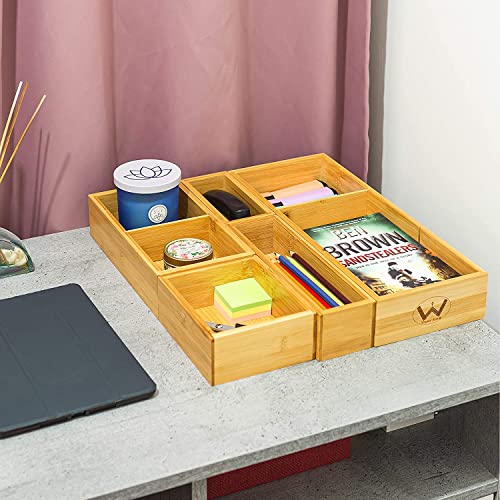 - Eco-Friendly and Natural – Our bamboo box organiser set is made of 100% natural bamboo which has a greater tensile strength. Natural bamboo has in-built antimicrobial properties and provides a great choice for home and kitchen organizational products. Our bamboo drawer organiser set is chemical-free and provides a healthy support to you and your family. Our bamboo drawer set is the best alternative from plastic and will accommodate most situations around your home or office