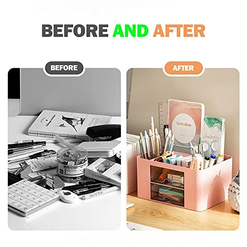 - ✍【Practical combination】Desktop storage box has 5 compartments and 2 transparent drawers. You can sort and store everyday items such as pens, sharpeners, stapler, scissors, rulers, glue sticks, folder holders, notes, lapel pins and pens. The ideal desk organiser makes your room cleaner and tidy.