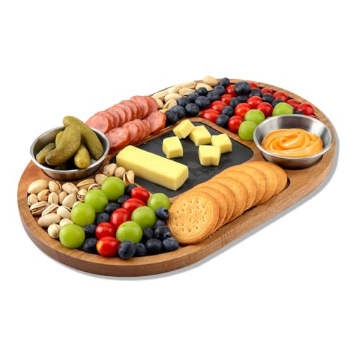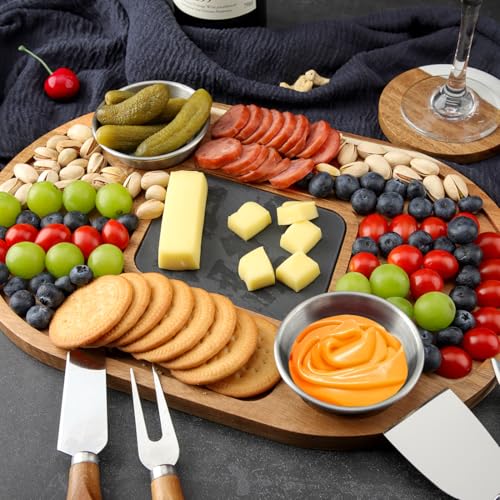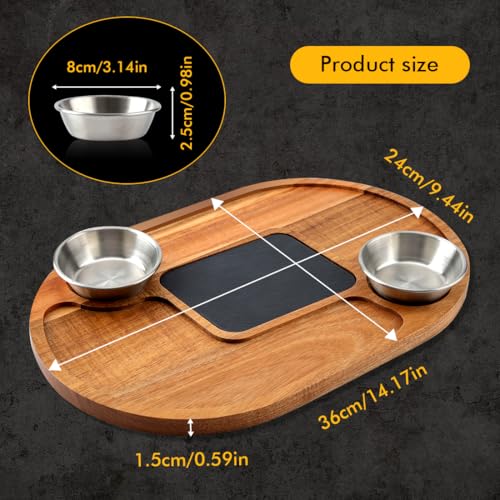 - The combination of 100% natural slate and an acacia wood base makes it more environmentally friendly and rustic. Makes a great gift for any occasion.This set includes a wooden board with a slate insert, 2 dipping bowls.