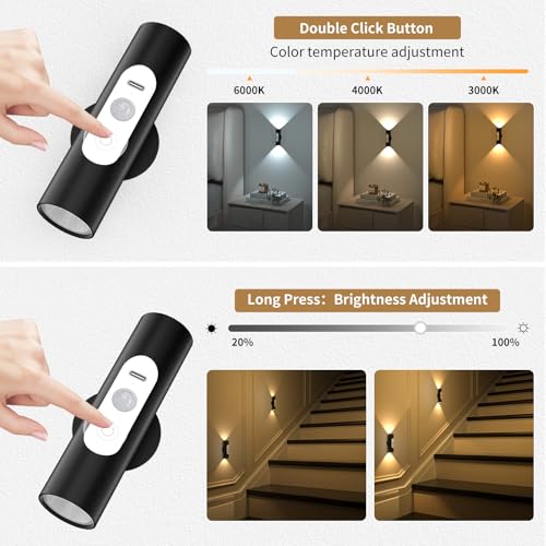 - Rechargeable Wall Sconce: This stick-on wall light has a built-in 2000mAh rechargeable battery, can work continuously for 30-60 days in auto mode (motion-sensing), and provides 10-80 hours of continuous illumination in always-on mode, long-lasting durability. Only takes 2-3 hours to fully charge with the included 1M USB-C charging cable