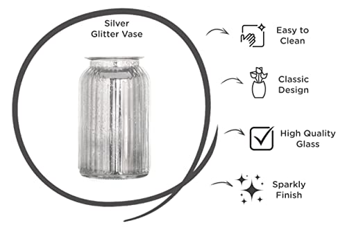 - An elegant silver flower vase. Perfect for adding a modern touch to any room. The sparkly vase is sure to be an eye-catcher.