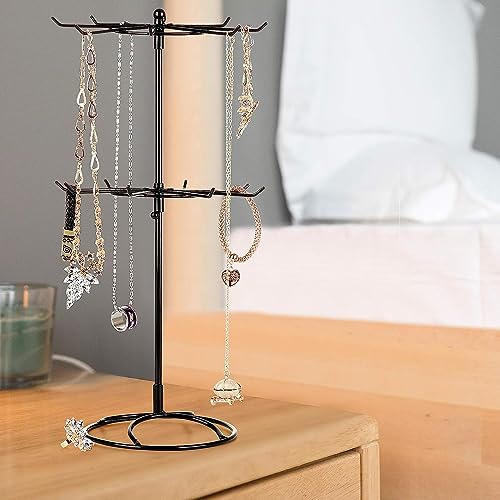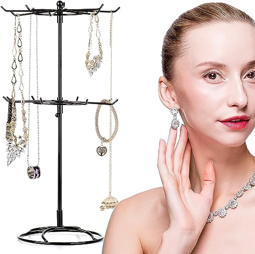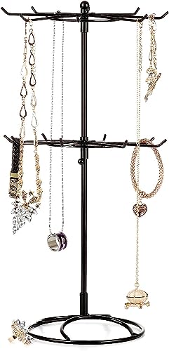 - SAVE SPACE — Rotating display stand With 2 tiers, every tier has 8 hooks can used hanging earrings,bracelet and necklace, etc. Display your jewelry collection neatly and save your space.