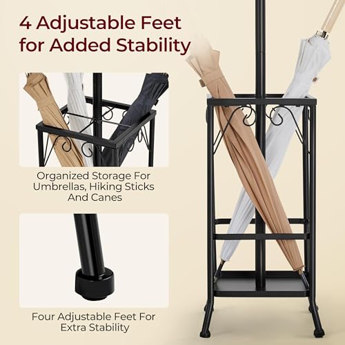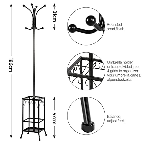 - Versatile And Multiple Purposes: 8 Top hooks with round heads of the coat hat tree to hang your coat, hat, bags and so on. The bottom umbrella stander of the rack has 4 grids to organize your umbrella, alpenstock, canes, etc. This versatile design of coat hat tree is perfect for a variety of occasions
