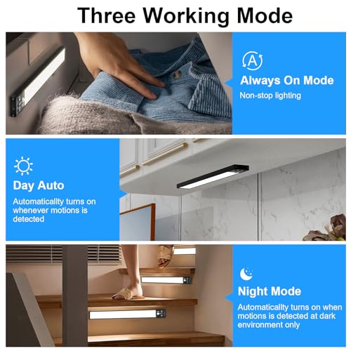 - 【Decently bright, Motion sensor functions perfectly】 The light has three settings, Always On so it stays on until you shut it off, Day Auto the light comes on when during the day time when motion is detected, and Night Auto that comes on only at night when motion is detected,The light shuts off after 30 seconds when there is no motion. This under cabinet light is perfect for under a kitchen cabinet, in a closet, a garage, or pretty much anywhere you need it